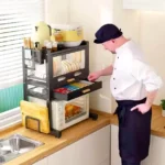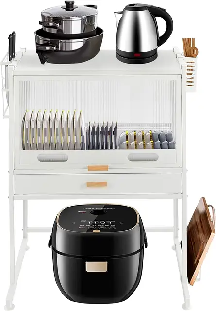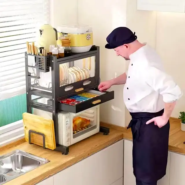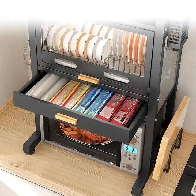 Horizontal space is the most valuable real estate in your kitchen. Traditional organization involves spreading items across the counter, which leads to clutter and exposure to cooking residue. This Carbon Steel Utility Station corrects that workflow by moving your inventory upward into a sealed, dustproof environment. By providing a high-clearance base for heavy appliances and a protected upper cabinet for dishware, it creates a structured micro-environment that remains clean, organized, and accessible.
