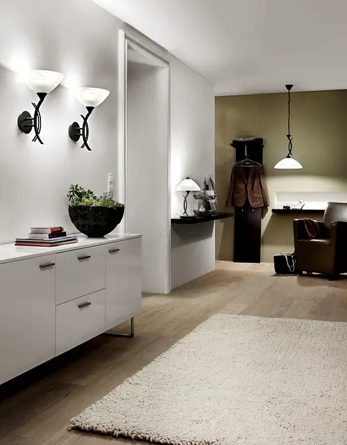 Diffused Atmosphere: Alabaster glass softens harsh light, flattering skin tones and warm wood furniture.