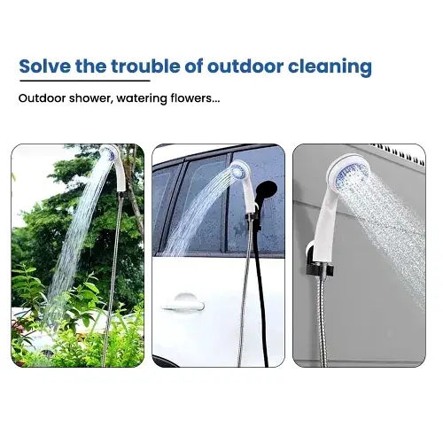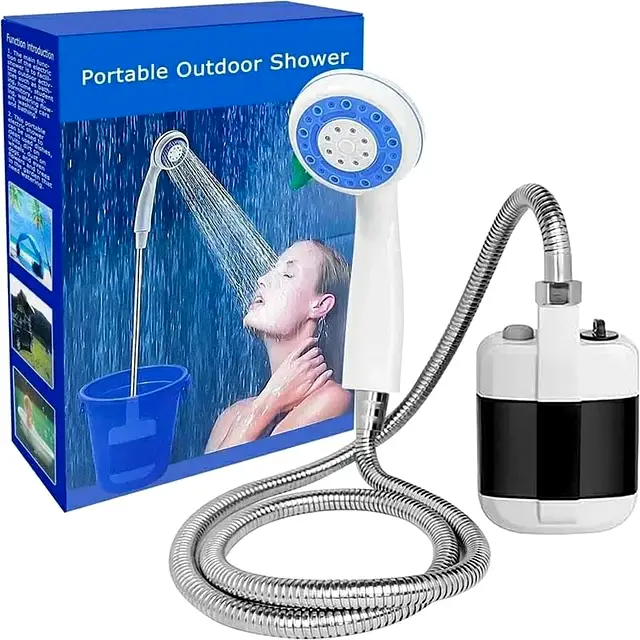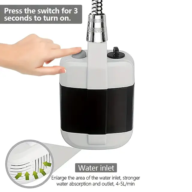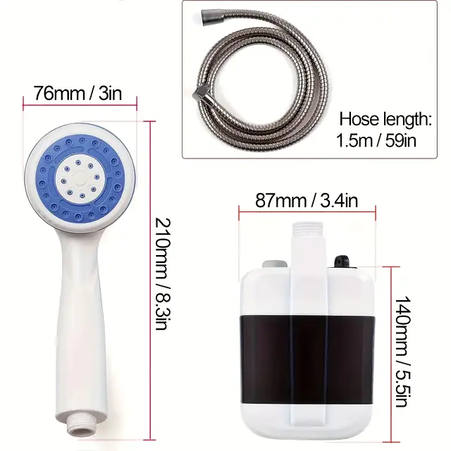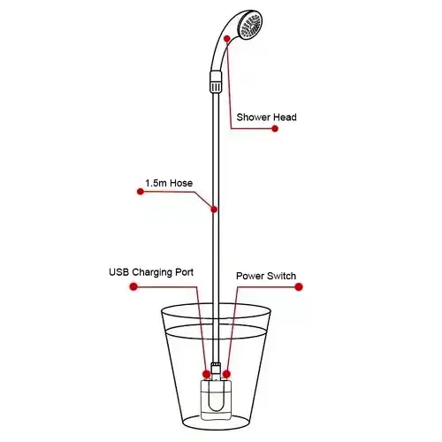 - Package Includes: Shower head, Water pump, Shower head fixing support, Connecting hook, Sucker, Charging cable