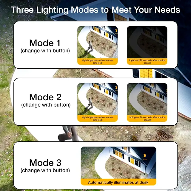 - Adaptive Motion Modes: Switch between full motion detection, dimmed delay, or a steady night light to suit your specific security needs.